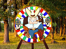 This game is a simulator of throwing a knife at a moving target.The goal of the game is to get the most points.Before starting the game, select a target, as well as the direction and speed of its rotation.Use the tip of the knife as a sight.To throw a knife, press the left mouse button.Since the target is moving, you need to aim proactively.Scoring:The game uses colored target.Points are added for hit:Green  + 1Blue   + 2Red    + 5Yellow + 10White  – 25% of the scoreIf you hit a person or a bomb, the game ends.When you hit a cowboy, he will shoot at you and take points until you make a successful knife throw.Bonus.You are invited to hit the target of a certain color. If you do this, then you get an extra knife.